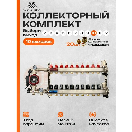 Коллектор для теплого пола на 10 контуров с насосом 25/6, смесительным узлом 1035 и евроконусами, до 120 кв/м