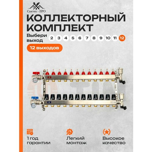 Коллектор для теплого пола на 12 контуров с расходомерами, кранами с термометрами до 140 кв/м