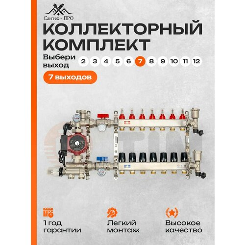 Коллектор для теплого пола на 7 контуров с насосом 25/6, кранами с термометром, смесительным узлом от 20-60С до 90 кв/м