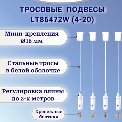 Тросовые подвесы белого цвета для монтажа светильников, шинопровода и др. оборудования - LT86472W(4-20). Комплект 4шт *2м. Регулировка длины!