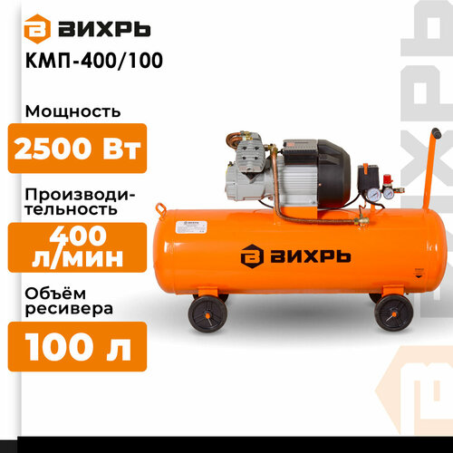 Вт, благодаря которой на выходе получается давление в 10 бар - безупречный показатель для компрессоров такого уровня. В отличие от других компрессоров из своего семейства Вихрь КМП-400/100Р обладает ременным видом передачи. Производительность модели вихрь КМП-400/100Р составляет 400 л/мин, при объеме ресивера 100л. Для более удобной транспортировки компрессор оснащён 4-я колесами.