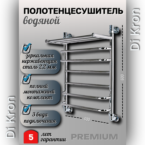 Полотенцесушитель Водяной узкий с полкой Di Kron, модель Premium-SP 600х400 из нержавеющей стали, 3 вида подключения