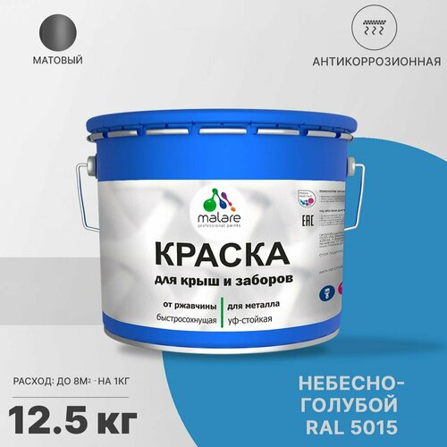 Краска Malare для металлического забора, для крыши из металла, для металлочерепицы, антикоррозионная, матовый, небесно-голубой, 12,5 кг.