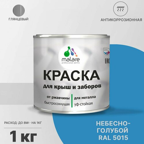 Краска Malare для металлического забора, для крыши из металла, для металлочерепицы, антикоррозионная, глянцевый, небесно-голубой, 1 кг.