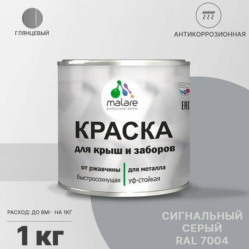 Краска Malare для металлического забора, для крыши из металла, для металлочерепицы, антикоррозионная, глянцевый, сигнальный серый, 1 кг.