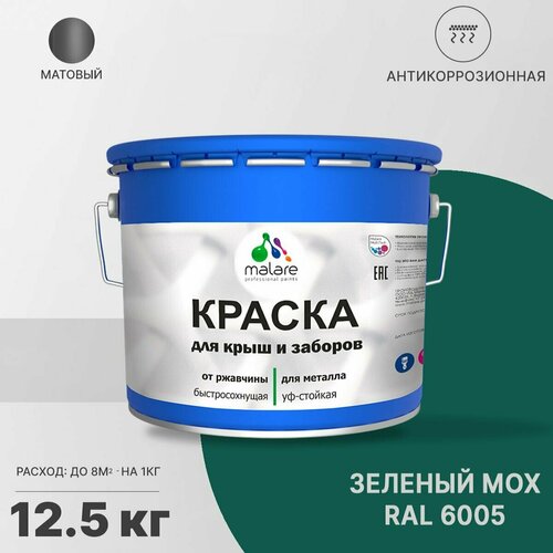 Краска Malare для металлического забора, для крыши из металла, для металлочерепицы, антикоррозионная, матовый, зеленый мох, 12,5 кг.