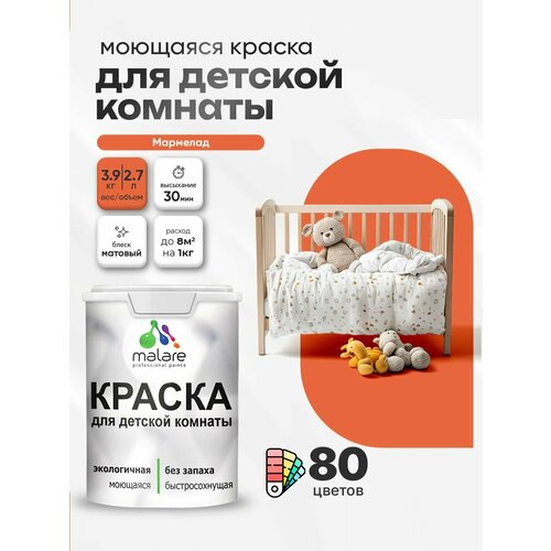 Краска акриловая (АК) Malare Краска Malare интерьерная для детской комнаты, для стен и обоев, для потолка, акриловая без запаха моющаяся матовая, мармелад (2.7л - 3.9кг) матовая Мармелад 2.7 л 3.9 кг