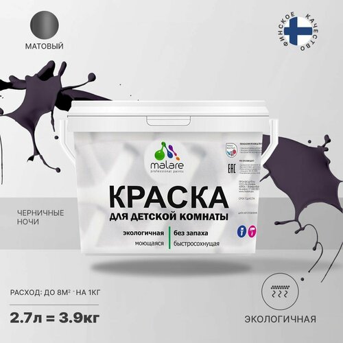 Краска Malare интерьерная для детской комнаты, для стен и обоев, для потолка, акриловая без запаха моющаяся матовая, черничные ночи (2.7л - 3.9кг)
