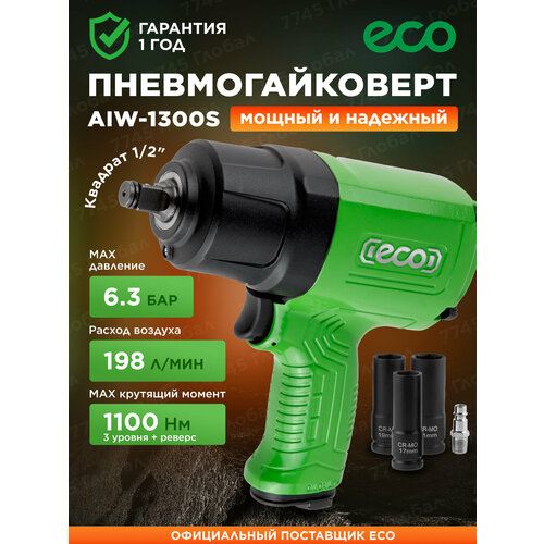 Пневмогайковерт ударный 1/2" с головками ECO AIW-1300S (ЕС3914-5)