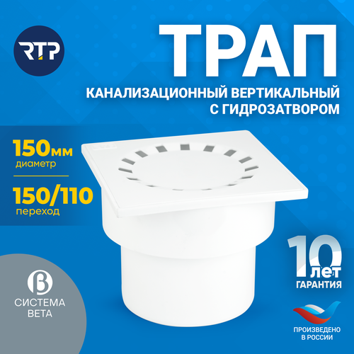Трап RTP D110 150x150 мм вертикальный (прямой) с гидрозатвором, решетка из пластика для канализации, полипропилен для труб PPR