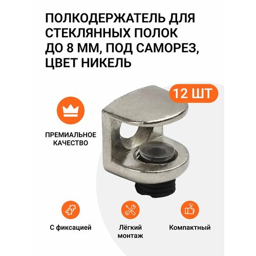 Комплект полкодержателей для стеклянных полок до 8 мм под саморез с фиксацией никель 12 шт