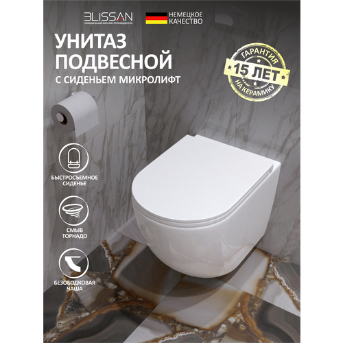 Унитаз подвесной безободковый Luxor BLISSAN смыв скрытый Торнадо 3.0 с сиденьем микролифт быстросъемное