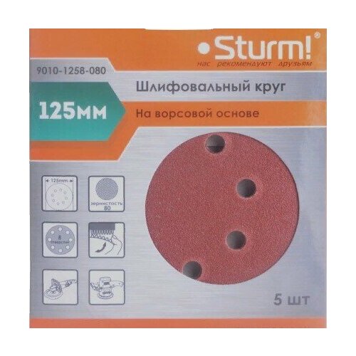 Круг шлифовальный Sturm! "под липучку", D125мм, зерн. 80, 8 отв, 5 штук.