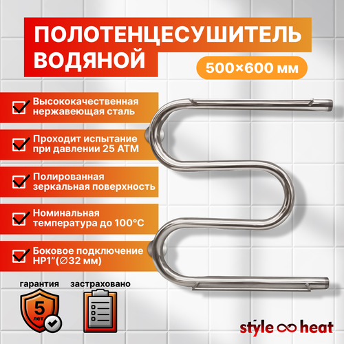 Полотенцесушитель водяной 500х600 с полкой форма М-образная нержавеющая сталь
