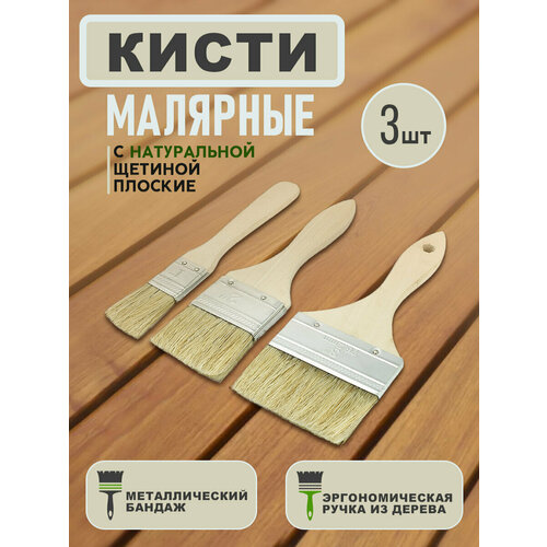 Кисти с натуральной щетиной плоские 3 штуки, флейцевые / Малярные кисти