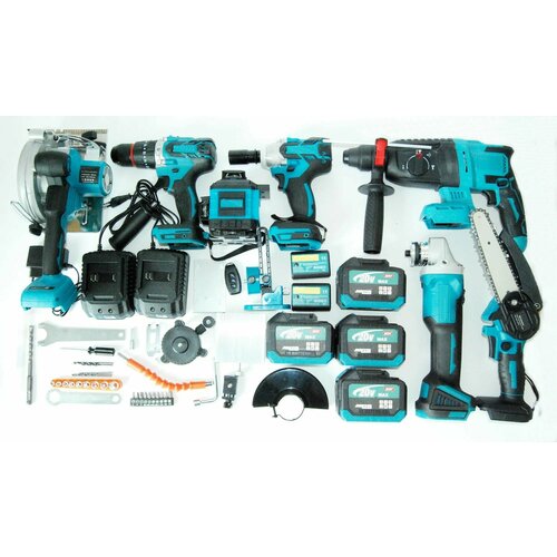 Набор аккумуляторного инструмента 7 в 1, 6 АКБ, нейлер, перфоратор, шуруповёрт, гайковёрт, болгарка, цепная пила, циркулярная пила