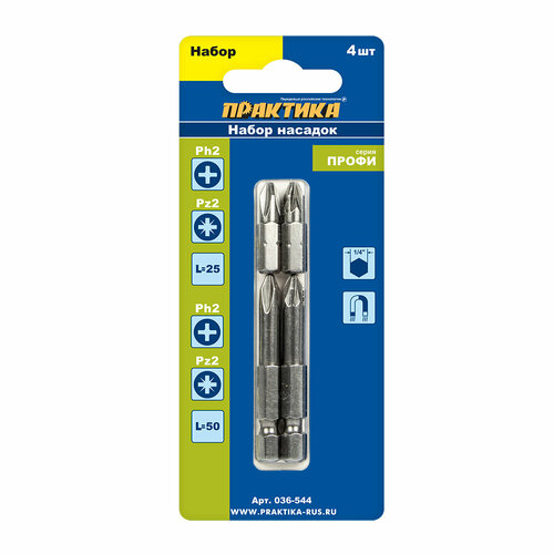 Набор бит ПРАКТИКА "Профи" 4шт PH2, PZ2 x 25мм, PH2, PZ2 x 50мм, блистер