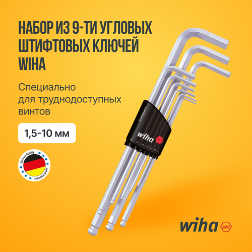 Набор из 9-ти угловых штифтовых ключей Wiha 1,5-10 мм, шестигранник со сфер. головкой, матовое хромирование