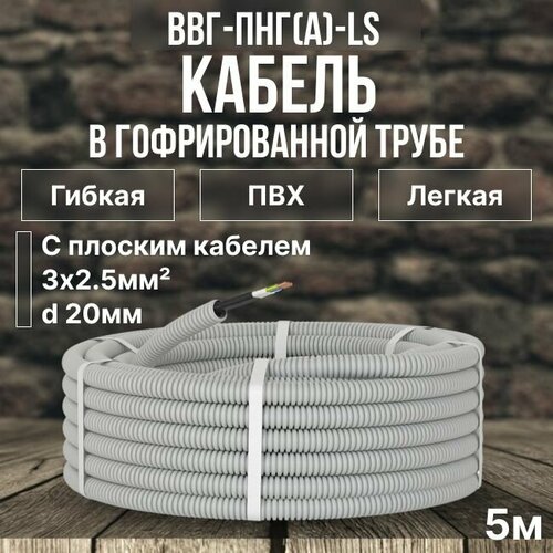 Кабель в гофре DKC Premium ВВГ-Пнг(А)-LS 3х2.5 Конкорд ГОСТ +, ПВХ серая D20 мм - 5м