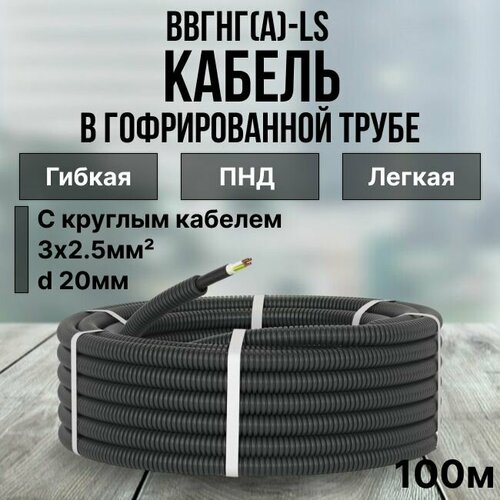 Кабель в гофре DKC Premium ВВГ-нг(А)-LS 3х2.5 Конкорд ГОСТ +, ПНД черная d20 мм - 100м