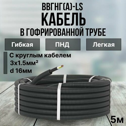 Кабель в гофре DKC Premium ВВГнг(А)-LS 3х1.5 РЭК PRYSMIAN ГОСТ +, ПНД черная D16 мм - 5м
