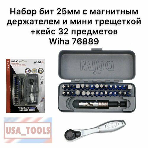 Набор бит 25мм с магнитным держателем и мини трещеткой +кейс 32 предметов Wiha 76889