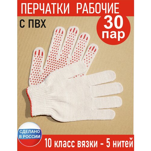 Перчатки рабочие ХБ с ПВХ, 10 класс, 5 нитей. 30 пар, белые