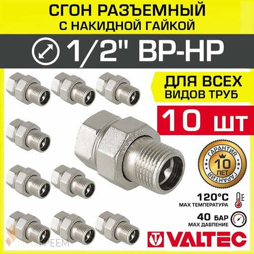 10 шт - Сгон прямой 1/2" ВР-НР VALTEC разъемный, латунный / Американка резьбовая (муфта с накидной гайкой) ДУ 15 для монтажа труб, арматуры в системе отопления и водоснабжения, VTr.341. N.0004