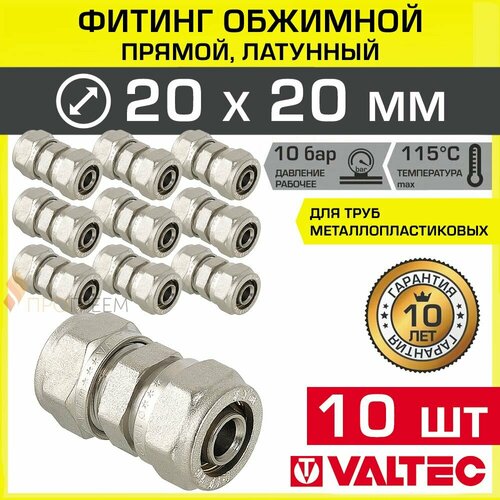 10 шт - Фитинг обжимной 20 мм прямой для металлопластиковых труб 20x2,0 мм VTm.303. N.002020 / Равнопроходное соединение латунное никелированное под обжим для трубопровода DN20 в системе отопления