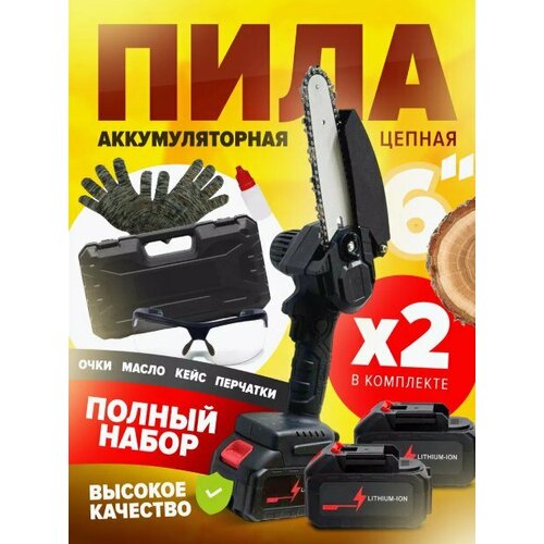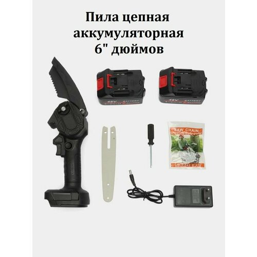 Пила аккумуляторная цепная садовая 2АКБ, 6 дюймов, 15см, шаг цепи 1/4", 1 скорость, мини-пила черный