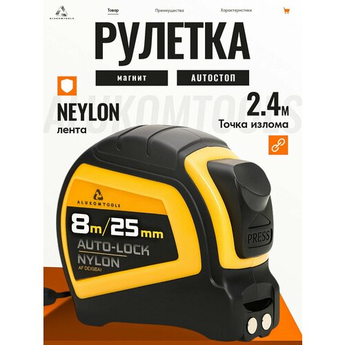 Рулетка строительная измерительная, 8мх25мм, AUTOLOCK нейлоновое покрытие, магнитный зацеп