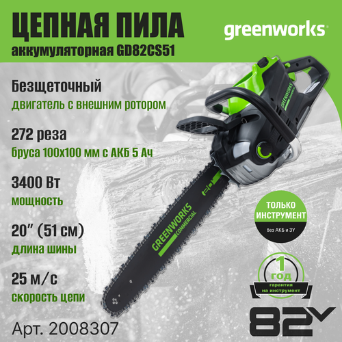 Цепная пила аккумуляторная Greenworks 2008307, 82V, 51 см, бесщеточная, без АКБ и ЗУ