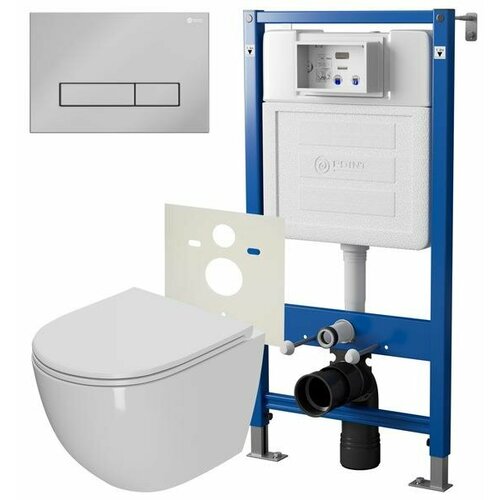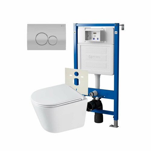 Безободковый, подвесной унитаз с ультратонким, антибактериальным сиденьем с плавным закрыванием и легкосъемным механизмом, петли хром, в комплекте с инсталляцией OLI 80 ECO и клавишей смыва воды OLI