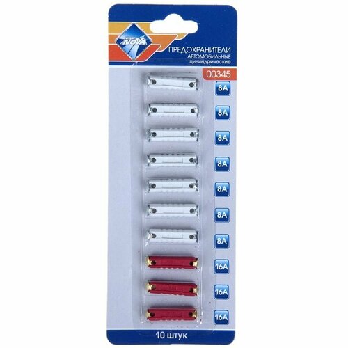 Предохранители цилиндрические Nova Bright, 8-16 А, набор 10 шт. Цилиндрические предохранители Nova Bright предназначены для защиты силовых, сигнальных и управляющих цепей от перегрузок и коротких замыканий. Применяются на автомобилях ВАЗ 2101‒2107 и некоторых европейских иномарках прошлых лет выпуска. Комплектация: 7 предохранителей на 8А, 3 предохранителя на 16 А. Материал: металл, пластик