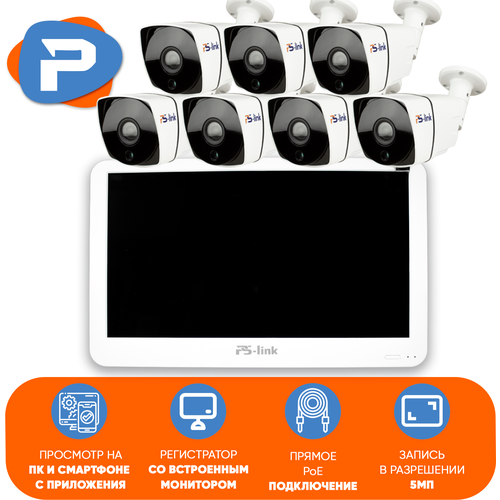 Комплект видеонаблюдения PS-link KIT-C507LCD IP-PoE/ монитор 10"/ 7 уличных камер/ 5 Мп
