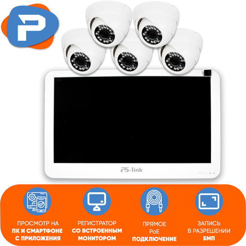 Комплект видеонаблюдения PS-link KIT-A505LCD IP-PoE/ монитор 10"/ 5 внутренних камер/ 5 Мп