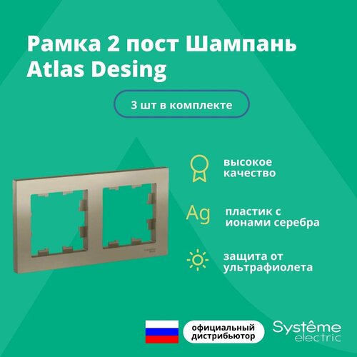 Рамка для розетки выключателя двойная Schneider Electric (Systeme Electric) Atlas Design Антибактериальное покрытие шампань ATN000502 3шт