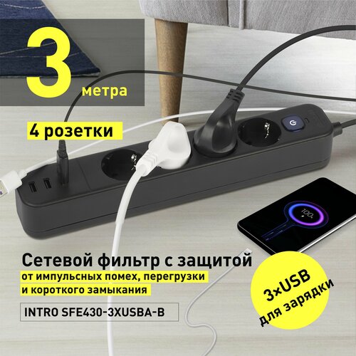 Сетевой фильтр Intro SFE430-3xUSBA-B с базовой защитой с заземлением с выключателем 4 розетки+3xUSBA 3,3A 3м 10А