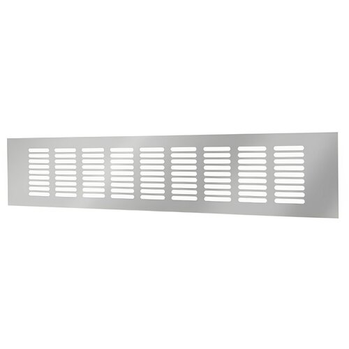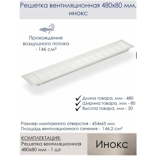 серый, инокс, серебристыйРешетка вентиляционная 500х80 мм, инокс - видимый элемент системы воздухообмена, закрывающий отверстие воздуховода внутри помещения.