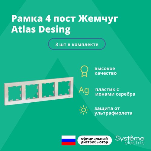 Рамка для розетки выключателя четверная Schneider Electric (Systeme Electric) Atlas Design Антибактериальное покрытие жемчуг ATN000404 3шт