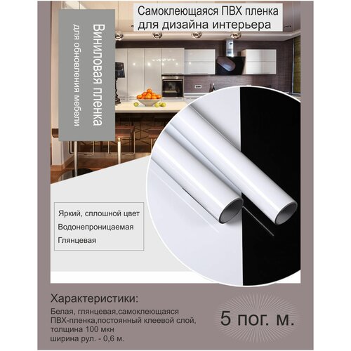 Самоклеящаяся белая пленка для мебели, для дизайна и интерьера. С черным клеевым слоем. Глянцевая, 100 мкн. 0,6х5 метров.