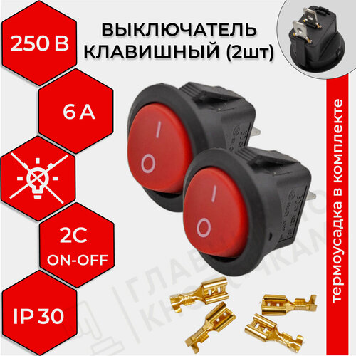 Выключатель клавишный круглый 250V 6А (3с) ON-OFF комплект 2 шт, (+ клеммы и термоусадка)