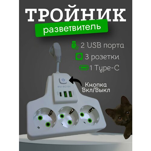 Тройник разветвитель с 3-мя розетками и 2 USB / Тройник с Type-C портом