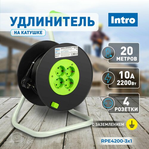 Удлинитель силовой Intro RPE4200-3x1 на пластиковой катушке c заземлением 4 розетки 20м ПВС 3х1мм2