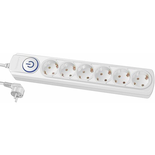 белыйсетевой фильтр, 6 розеток, макс. нагрузка 2200 Вт, макс. ток 10 А, заземление, выключатель на корпусе, длина кабеля: 1.8 м, белый