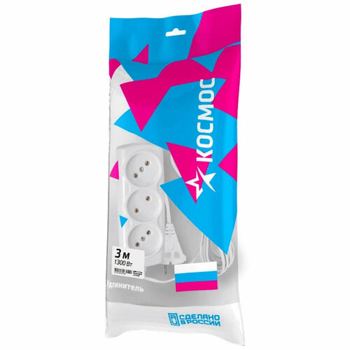 Сетевой удлинитель Космос, 6А, 3 гн, 5м, ПВС, 2х0.75, белый, 1 шт