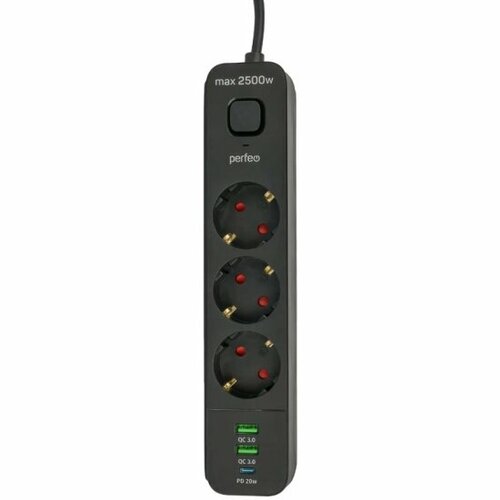 Perfeo сетевой фильтр PERFEO POWER SPRING, 2500W, 2,0м, 3 розетки, 2USB +1TYPE-C (QC3.0+PD 20W) черный.