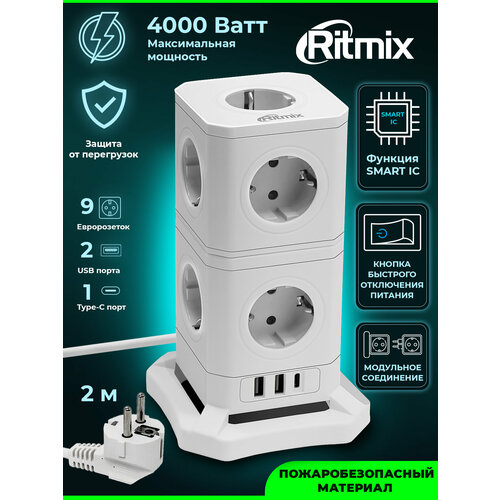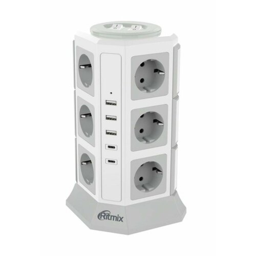 –башня RM-2124. Он отлично подходит для современной мобильной, домашней или офисной техники. И суммарно поддерживает потребление до 4000 Вт. 12 розеток и 4 порта USB позволяют одновременно подключить для питания или зарядки до 16 устройств. Премиальное качество сборки и компонентов для надёжной и долговечной работы. Особенности:12 выходов евророзеток; встроенная функция Smart IC, за счет которой сетевой фильтр автоматически распознает подключенное устройство и подает оптимальный ток для быстрой и безопасной зарядки; 4 выхода USB Type А 5 В, 3,1 А (суммарно) благодаря интеллектуальному контролю тока позволяют быстро и безопасно заряжать различные устройства (смартфоны, планшеты, цифровые камеры, smart-часы, беспроводные