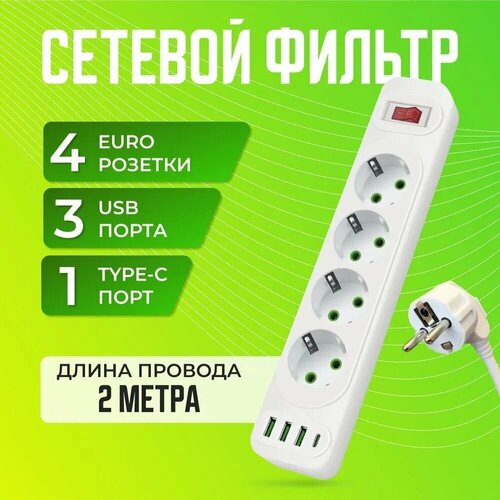 Сетевой фильтр, сетевой фильтр удлинитель, сетевой фильтр 2 USB, 4 розетки, Type-C, выключатель на корпусе, 2 метра