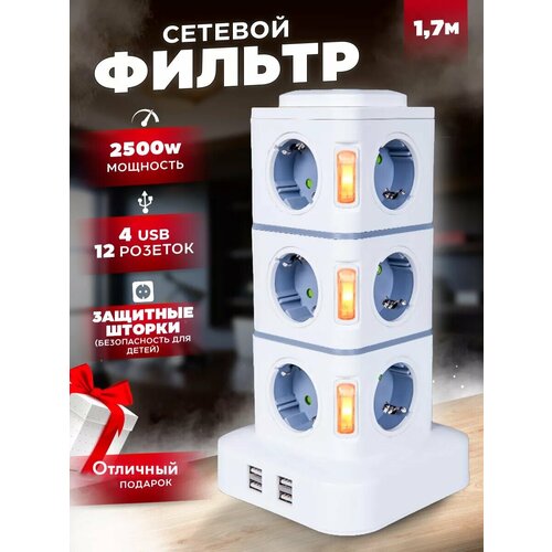 Сетевой фильтр , удлинитель/Сетевой тройник с переключателем на 12 розетки, 4 входа для USB Type-A /тройник/для дома/удлинитель PRO